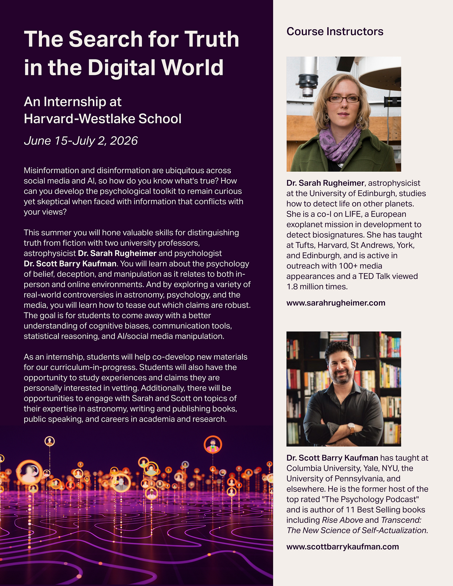 I wanted to let you know about this internship opportunity hosted by Harvard-Westlake School in Los Angeles this Summer, June 15-July 2. I am teaming up with the astrophysicist Dr. Sarah Rugheimer to teach critical thinking and the search for truth in L.A. for high school students. Spaces are limited and will fill up fast! If you know of any high school students in the L.A. area who may be interested in this internship, have them register an application asap: hwleadership.campbrainregistration.com/Landing.